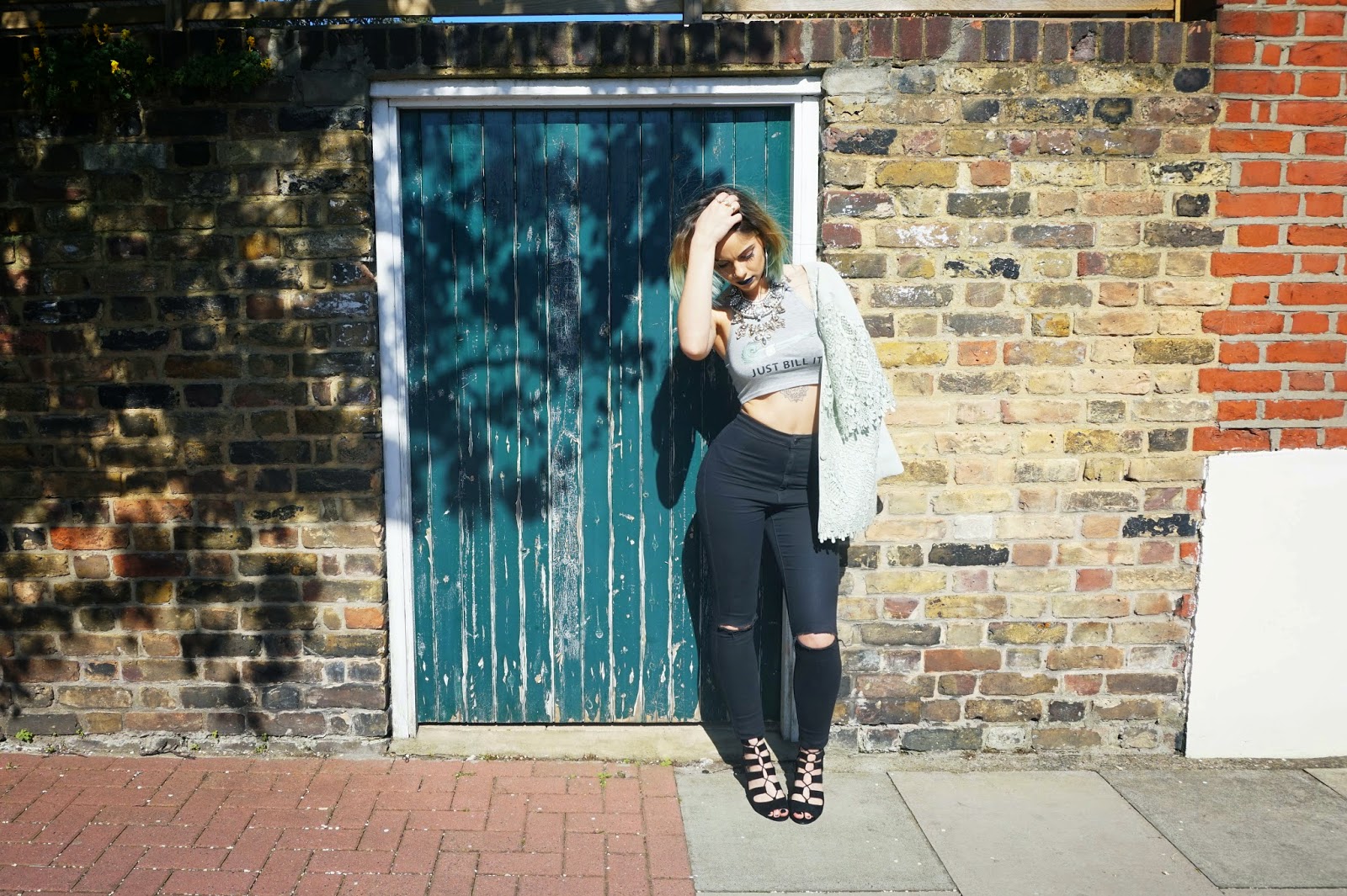 Styling up the sandals I opted for my ripped skinny jeans, 90s slogan crop top and vintage lace jacket. The slogan crop features green in the graphic so tying in the mint green jacket works well. I love styling this way by picking out key shades and working them together.
