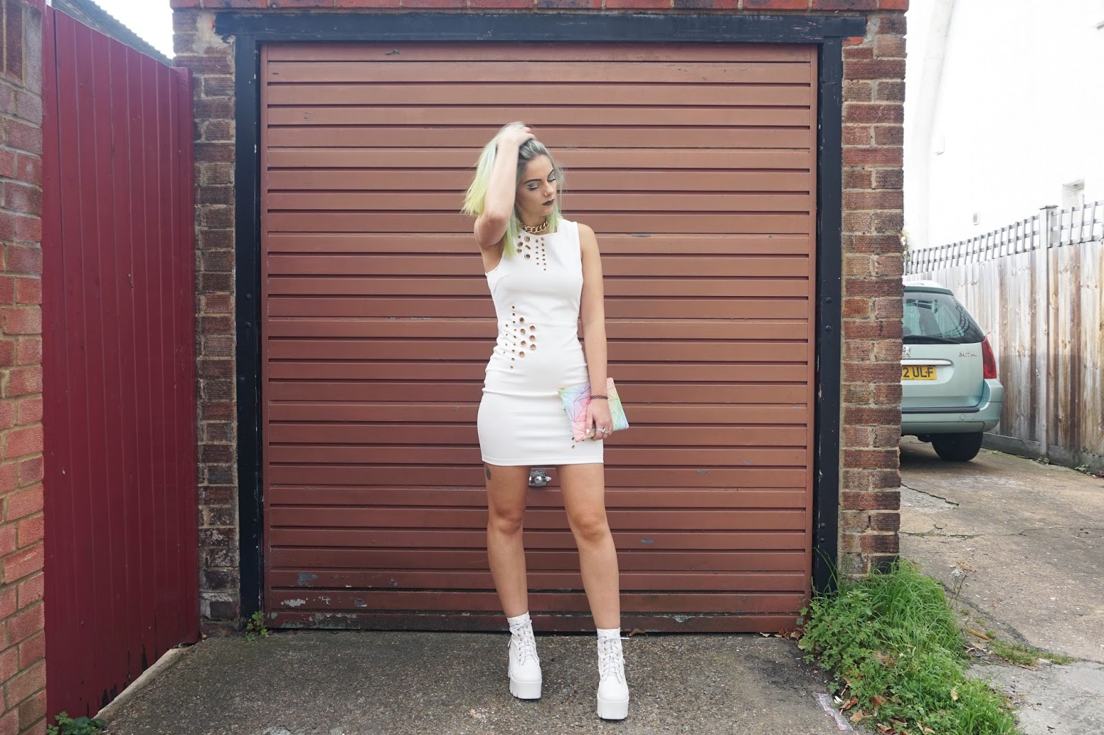 Styling it up, instead of the obvious white heel choice some people might make, I thought I’d give the look a bit of a edge and style white platform boots with the outfit; which I think looks great. The all white look against my hair and print clutch bag from Create & Case comes together to make a fab going out outfit. The print clutch is the perfect shade to compliment my green mermaid locks.