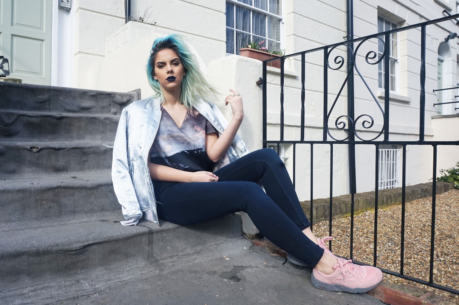 Whenever I’m styling jeans, trainers are pretty much the shoe I always opt for. They pair well with jeans and add to the comfiness of the look. These particular ones are from Puma and I love the pink and grey palette. For the rest of the look, I stuck with the pink and grey tones and paired my silver bomber and neoprene tee with the outfit. Simple and casual!