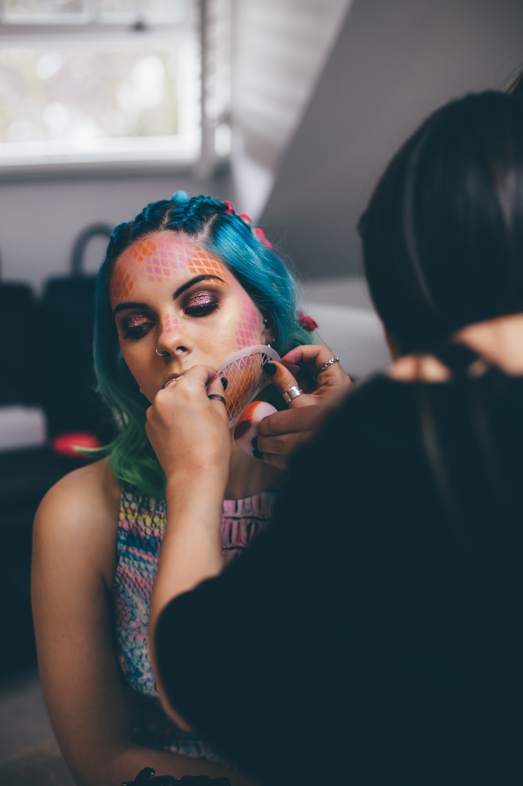 For the makeup they focused on creating glitter eyes and then scales for the rest of my face. For the hair it was braided into 3 little plaits and pom poms were woven in. I loved this creative look, I hadn’t seen pom poms in the hair before so it was cool to do something different and new.