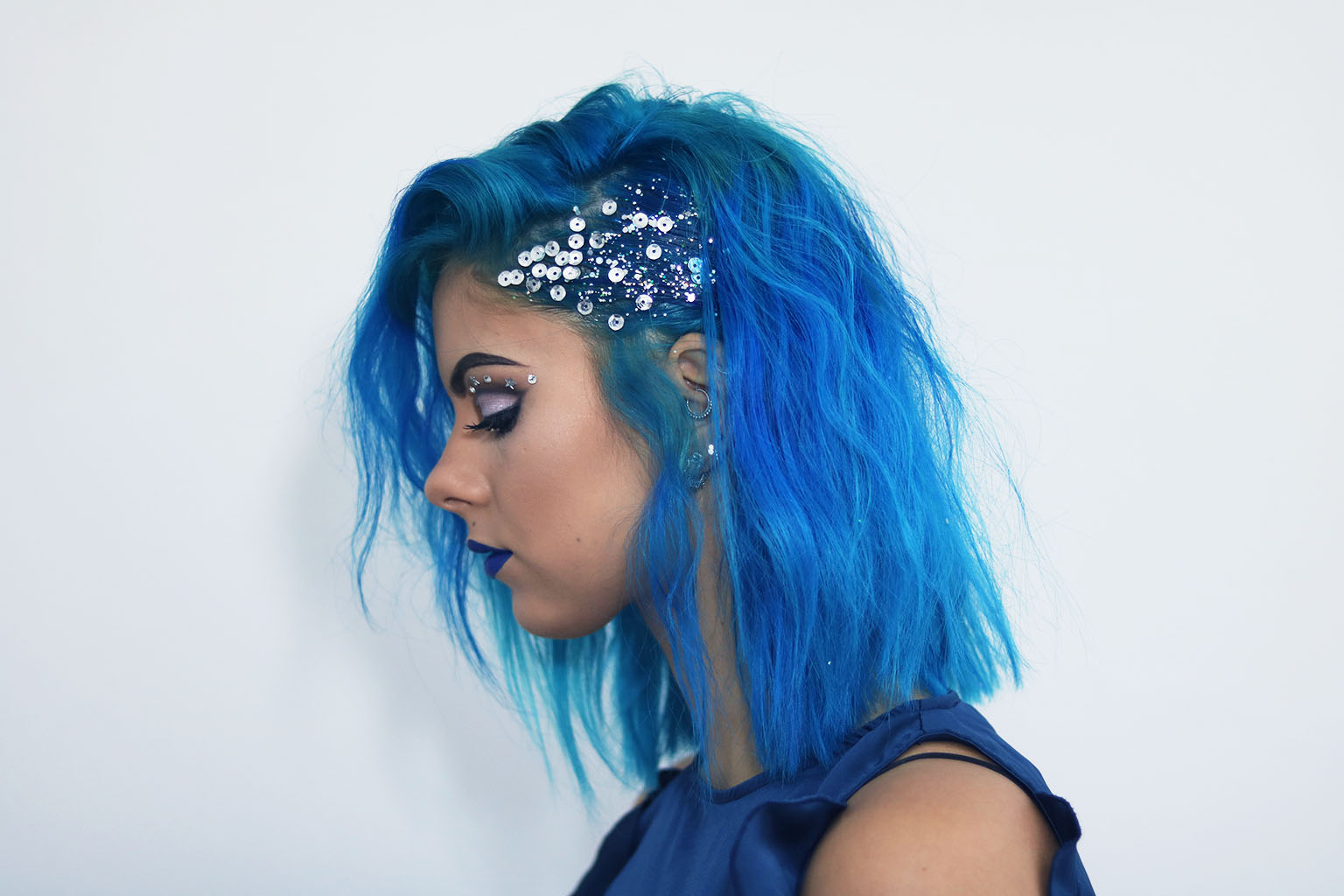 Once the gel was applied, I then used a brush to sprinkle and place glitter on top of the gel. The glitter I didn’t feel was enough though, so I also stuck on some sequins. To secure these in place, I added a dab of gel to the sequin before sticking it onto my hair. I created a cluster of sequins closer to my forehead, before spacing them out the further my hair went back.