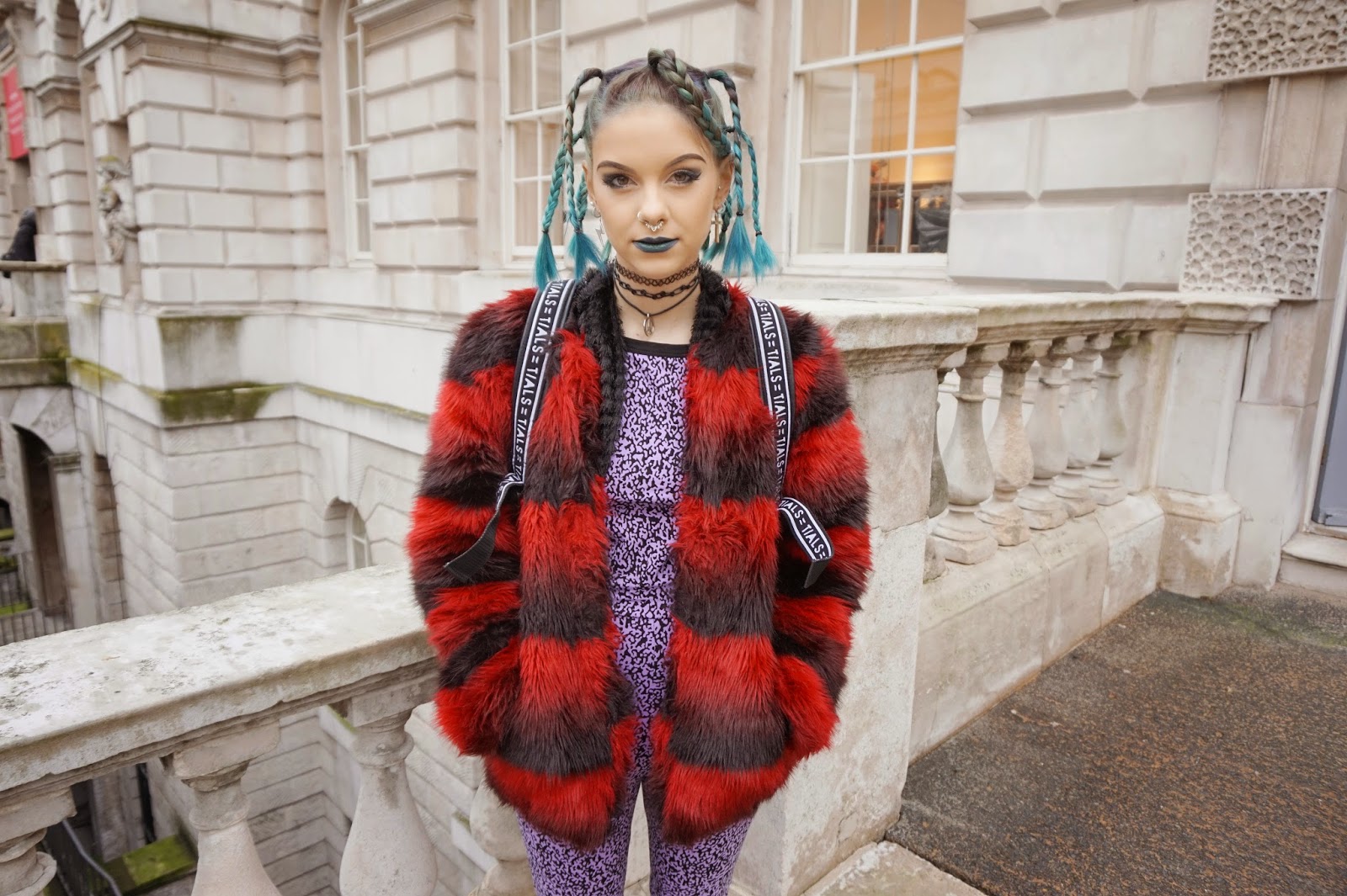 As most of you know my style is pretty bold, 90s and I like to have an edge to my looks. I collaborated with Motel Rocks this LFW and they gifted me 2 items to promote for them, their Dal Unitard in Static Lilac & North Slip Dress in Fringe Silver. I wore the unitard on Day 1 (Friday) and styling it up I went for a bit of a drag queen look! I went all out on my hair and make up with adding braids to my hair and dark eyes and lips to my face. I kept the main look simple with just styling the unitard with black patent sandals and black mesh socks. But because it was SO chilly outside and I knew I was going to be outside queueing for shows most of the day I paired my look with my statement, grunge fur coat. It was very clashy, but with LFW you can get away with anything.