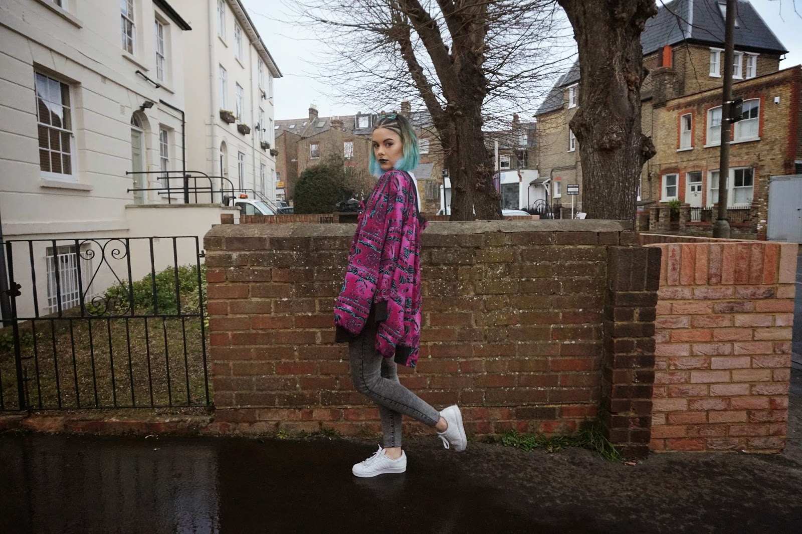 This look I’ve styled up for you is a pretty casual, everyday outfit that everyone can wear. It features my fave bold print vintage bomber jacket that I just adore! It’s weird, you’d think being so bright and in your face it would be hard to work into outfits, but it’s actually really easy. The pink, teal and black work with most other colours.
