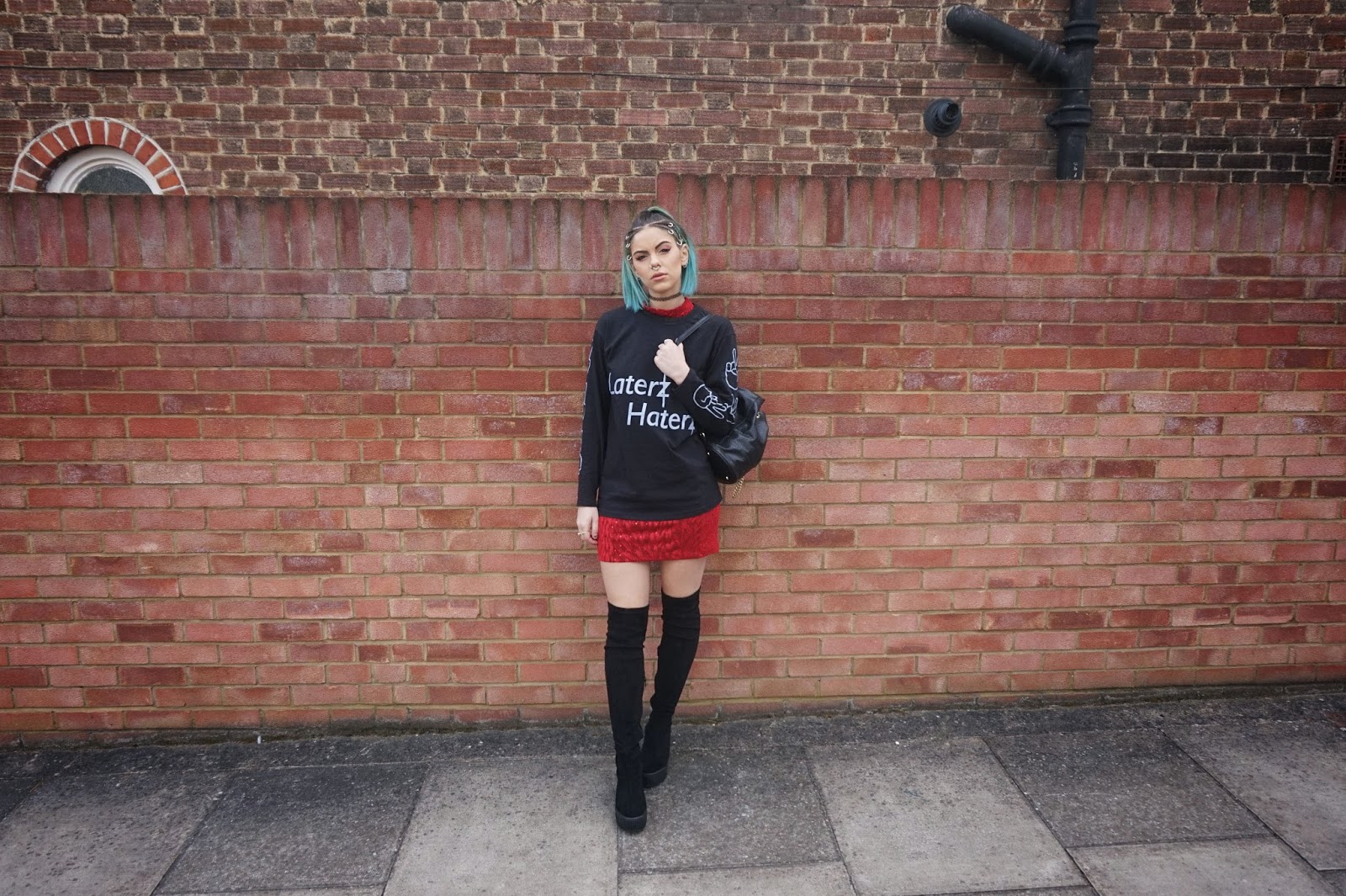 Because the tee is fairly long, not long enough to get away with it just on it’s own, you can pair a bodycon dress underneath. Now this doesn’t have to be red, it can be anything you like. I definitely think a bold colour would work best, something still a bit 90s, grunge so it goes with the style of the tee.