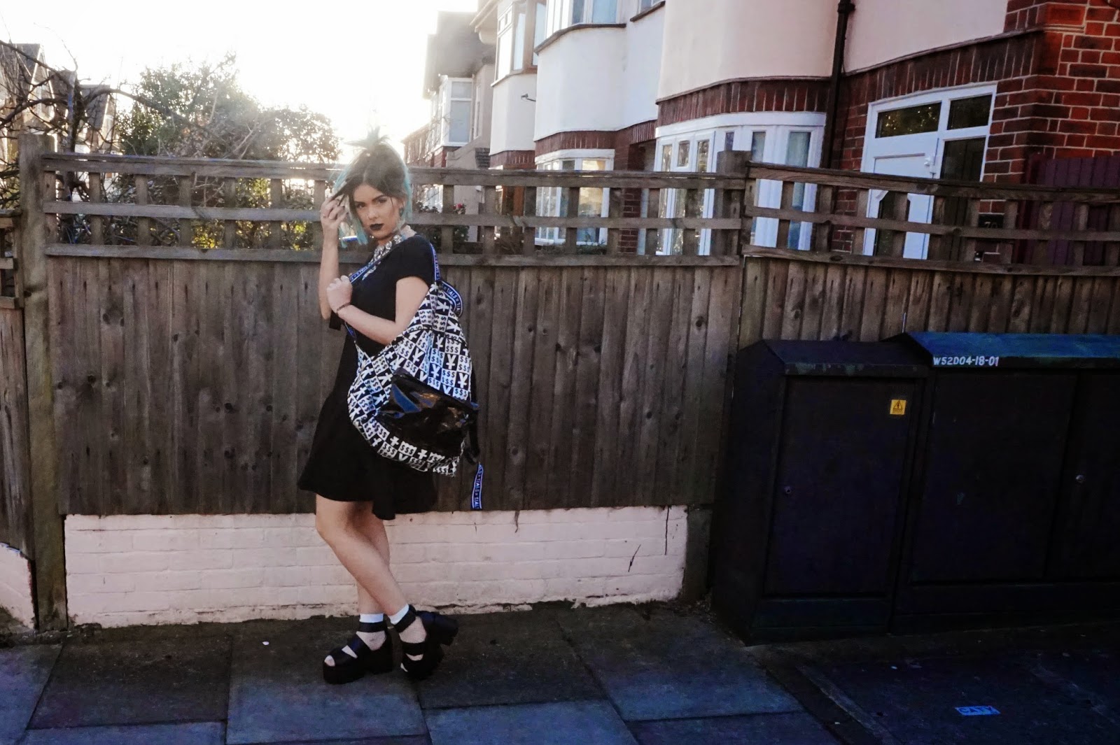The print on the backpack really ties this look together as otherwise it would be too plain and simple for what I like; having greeny blue hair also helps this. The dress is rather oversized and long for my short body, so pairing it with these chunky, platform sandals gives me extra height and lengthens my legs. Thank you to whoever came up with platforms. All the height and no pain! I hate wearing heels.