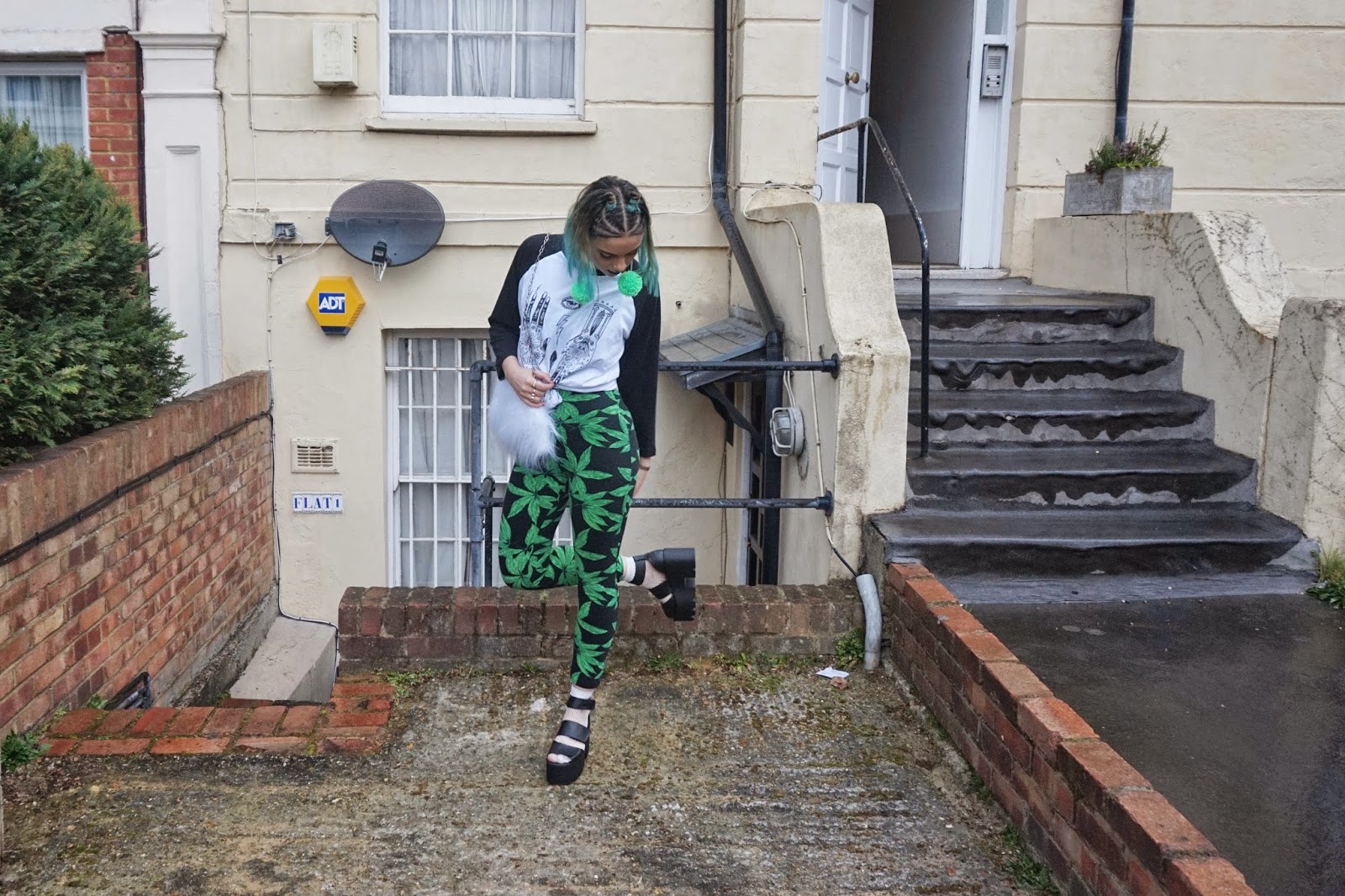 Anyway… This look was concentrating on styling up this wicked graphic tee from Olive And Frank. I absolutely dig the graphic with the tattoo henna hands and mystical symbols. Because the top is monochrome, I thought I’d add a splash of colour in and combine my palm print unitard with the look. I used a hair band to knot the front of the top together to crop it, paired it with white mesh socks, platform sandals, pom pom earrings and a fluffy bag to finish off the look. I love the look I achieved. I have chosen a colour palette, stuck to it and worked with it, accessorising accordingly. A very 90s, street look which looks awesome with my braids!