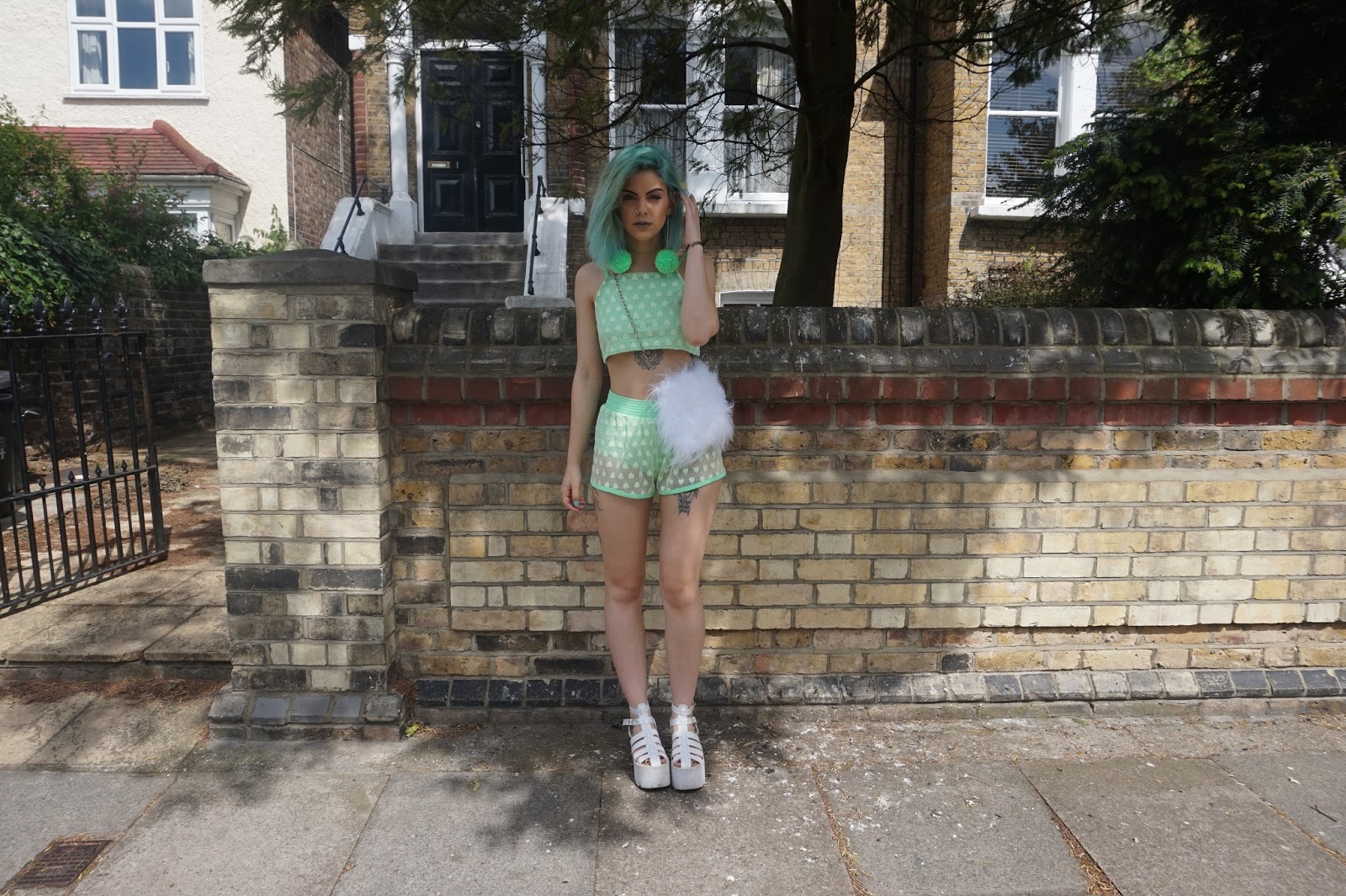 With accessories, because the coord is quite bold and lime green, I thought matching that with my fluro pom pom earrings and lime choker would make it pop even more.
