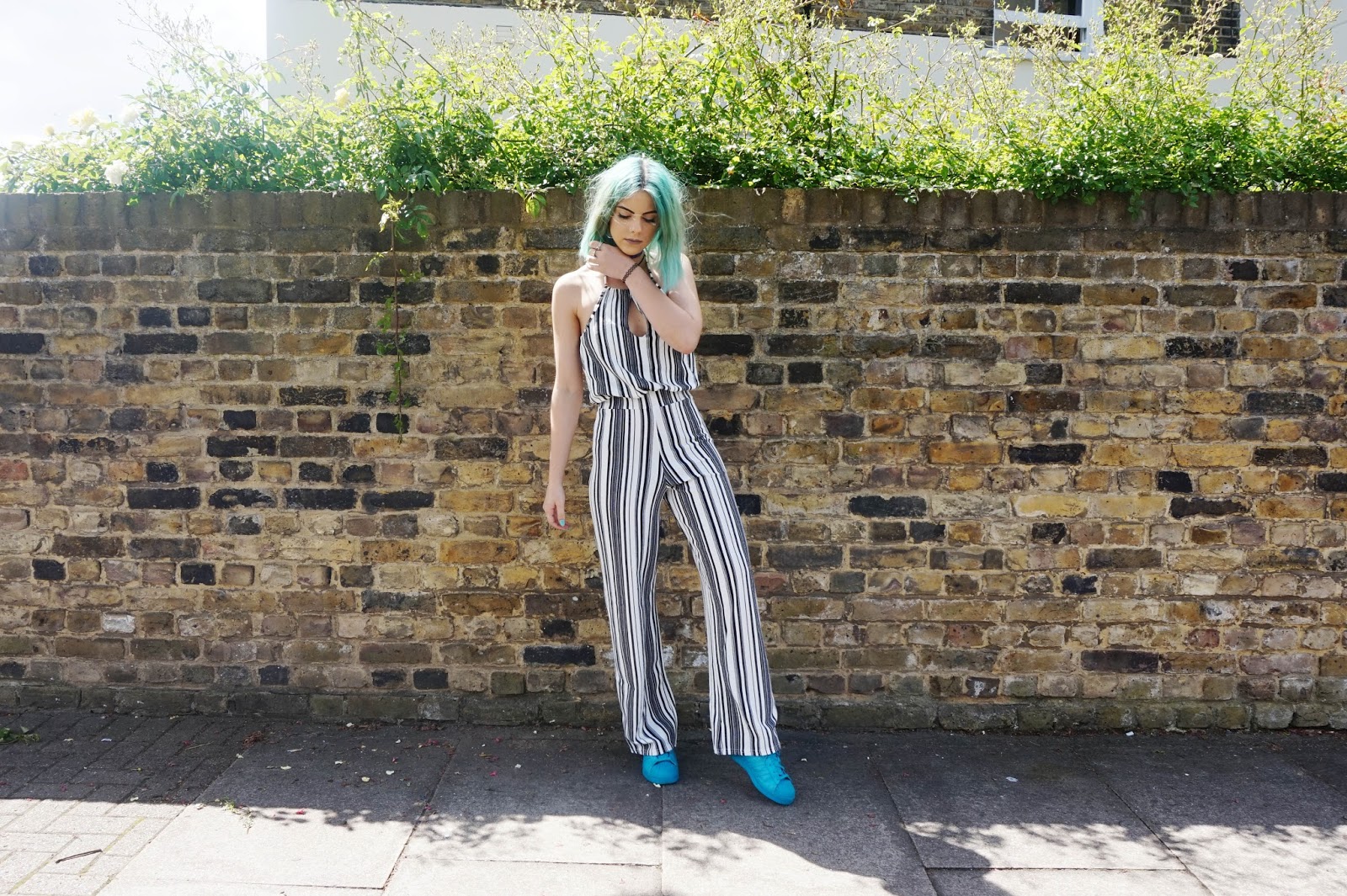 I am really liking wide leg bottoms. I’m finding them to be just as flattering as long as they’re still high waisted. This jumpsuit has wide leg bottoms joining to a halter neck top. I love the design of the jumpsuit with the stripes. I have been wanting something striped for a while now because I had the idea of wearing it with a bold colour.