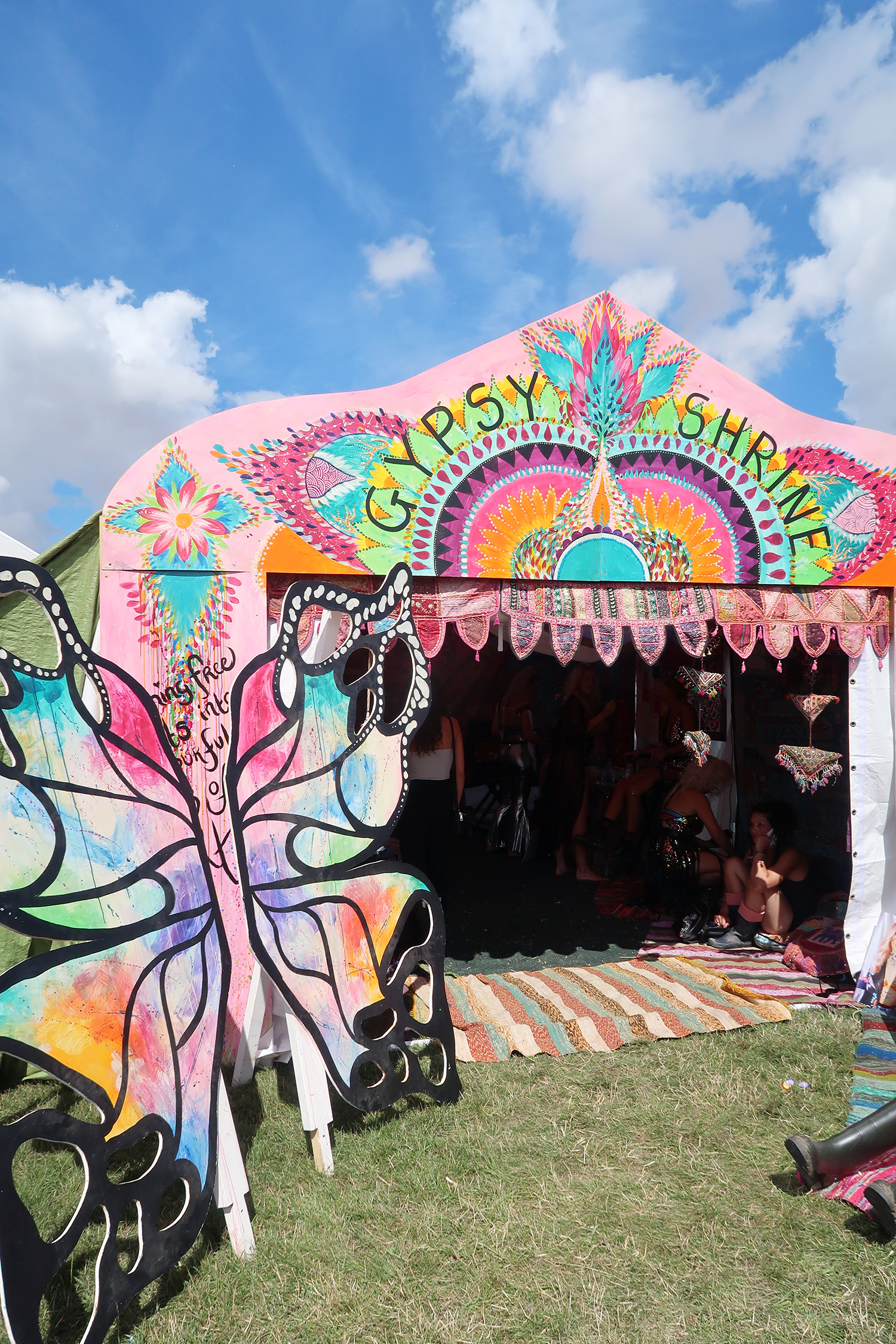 Rocket Dog kindly sent me and Charlotte Hole to the festival and we had a blast! It was so nice to hang out with Char again as I hadn’t seen her for a while. I drove us to the festival with all our camping gear in tow and we set up around 1pm on the Friday. It was a bit manic trying to find a space for our tent as the festival actually started on the Thursday, but after a little exploring we found a spot. We quickly set up and headed straight for The Gypsy Shrine tent to get glittered up. This was the first time I hadn’t bought any glitter or gems with me! I was relying on the babes from The Gypsy Shrine to sort me out, and they did.