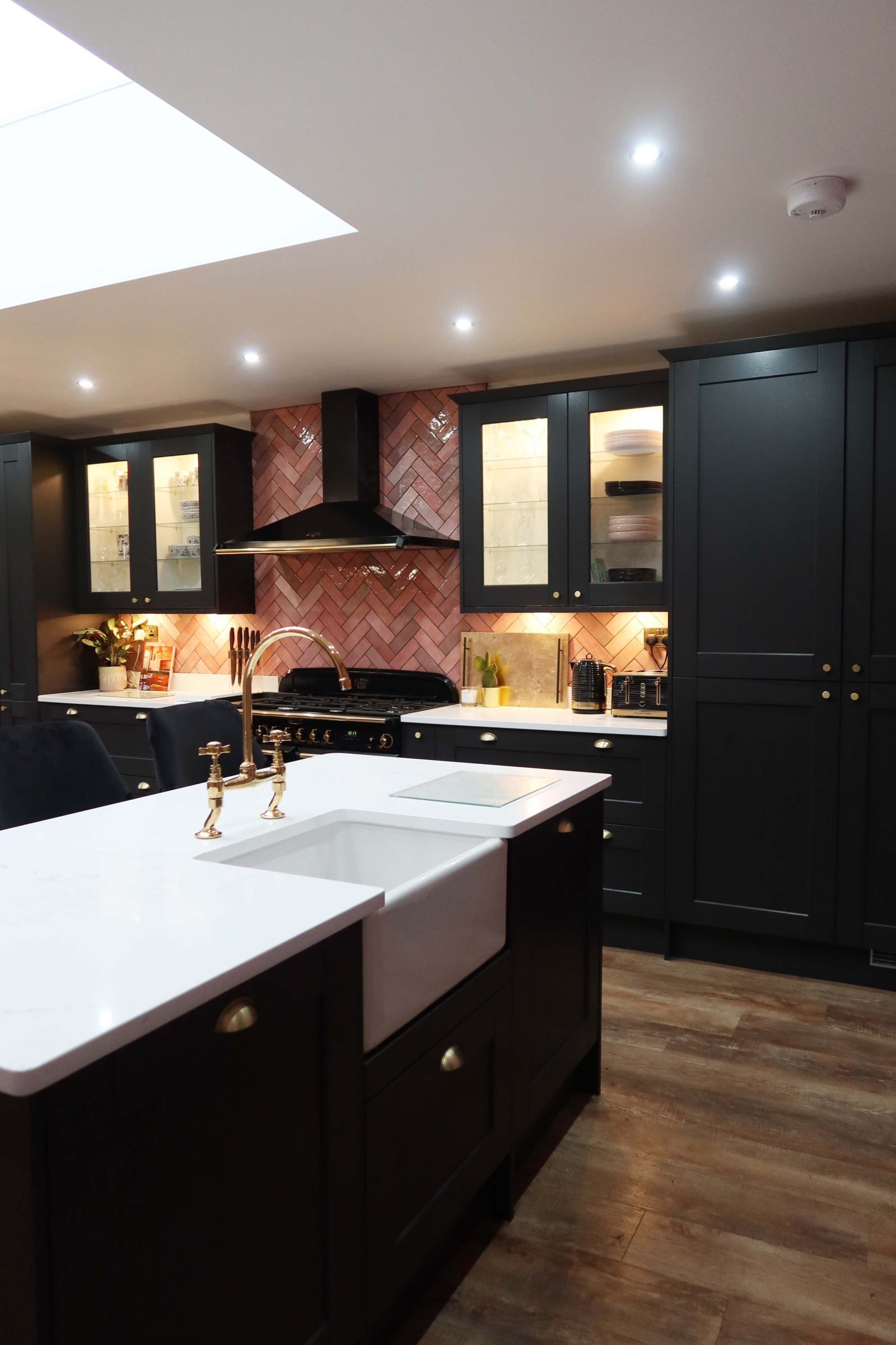 We kept everything quite symmetrical with the Rangemaster in the centre and then drawers and glazed cupboards either side going into the tall units housing storage and the built in fridge freezer. So glad we went for a build in fridge freezer as it just makes it look neater. My one key thing about this kitchen was that I didn't want lots of things out on the worktops. Our old kitchen hardly had storage so a lot of appliances were on show and it was always messy even if you had cleaned it.